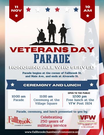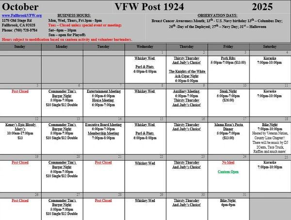 Any Questions regarding any meal or events please email us at info@Fallbrookvfw.org